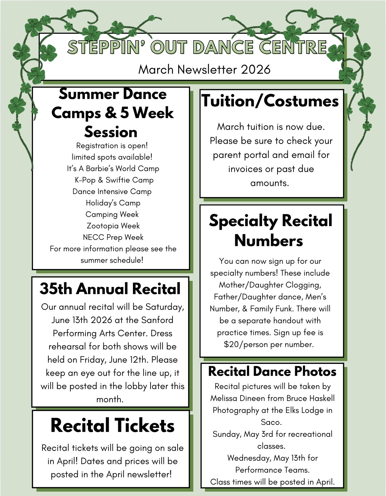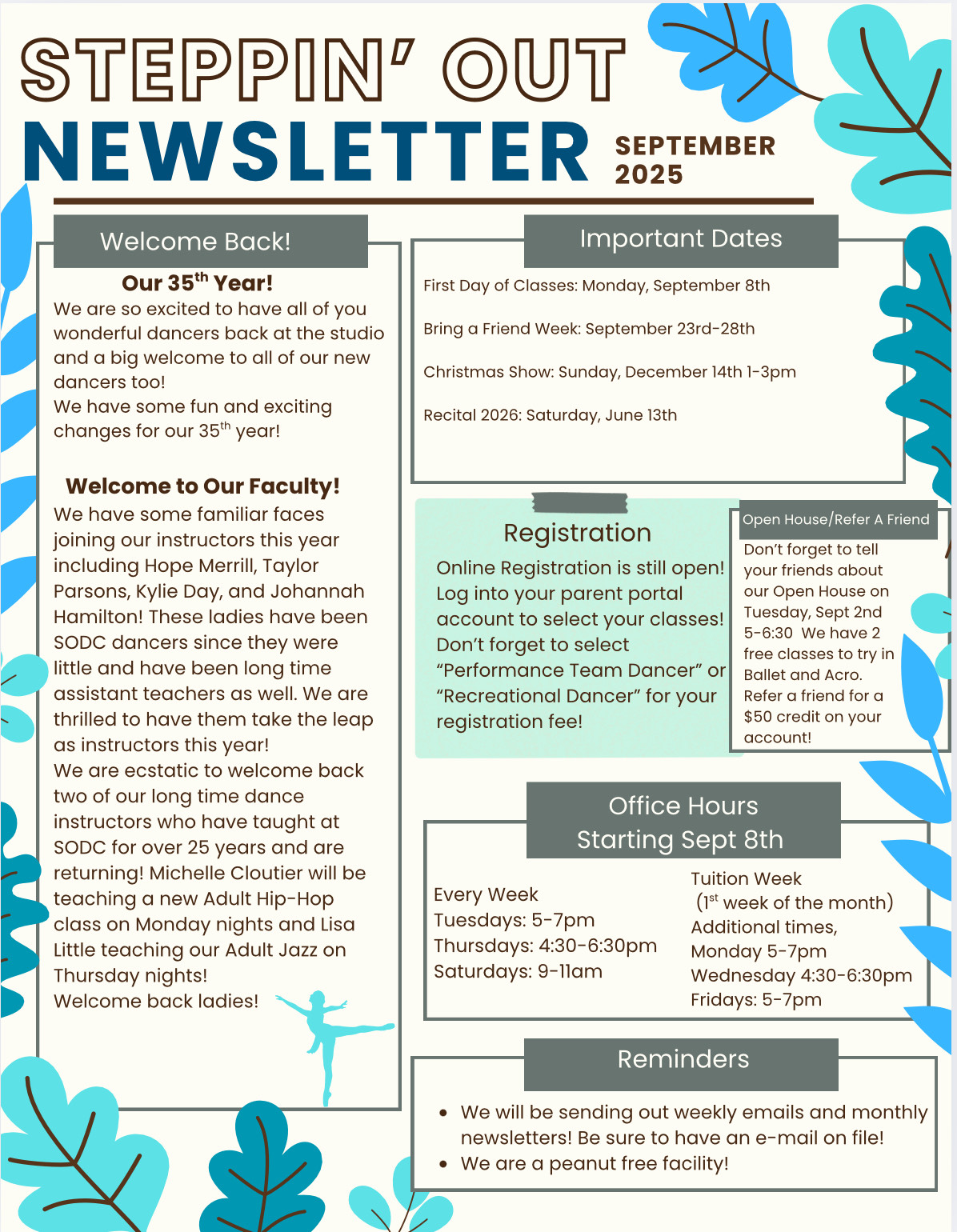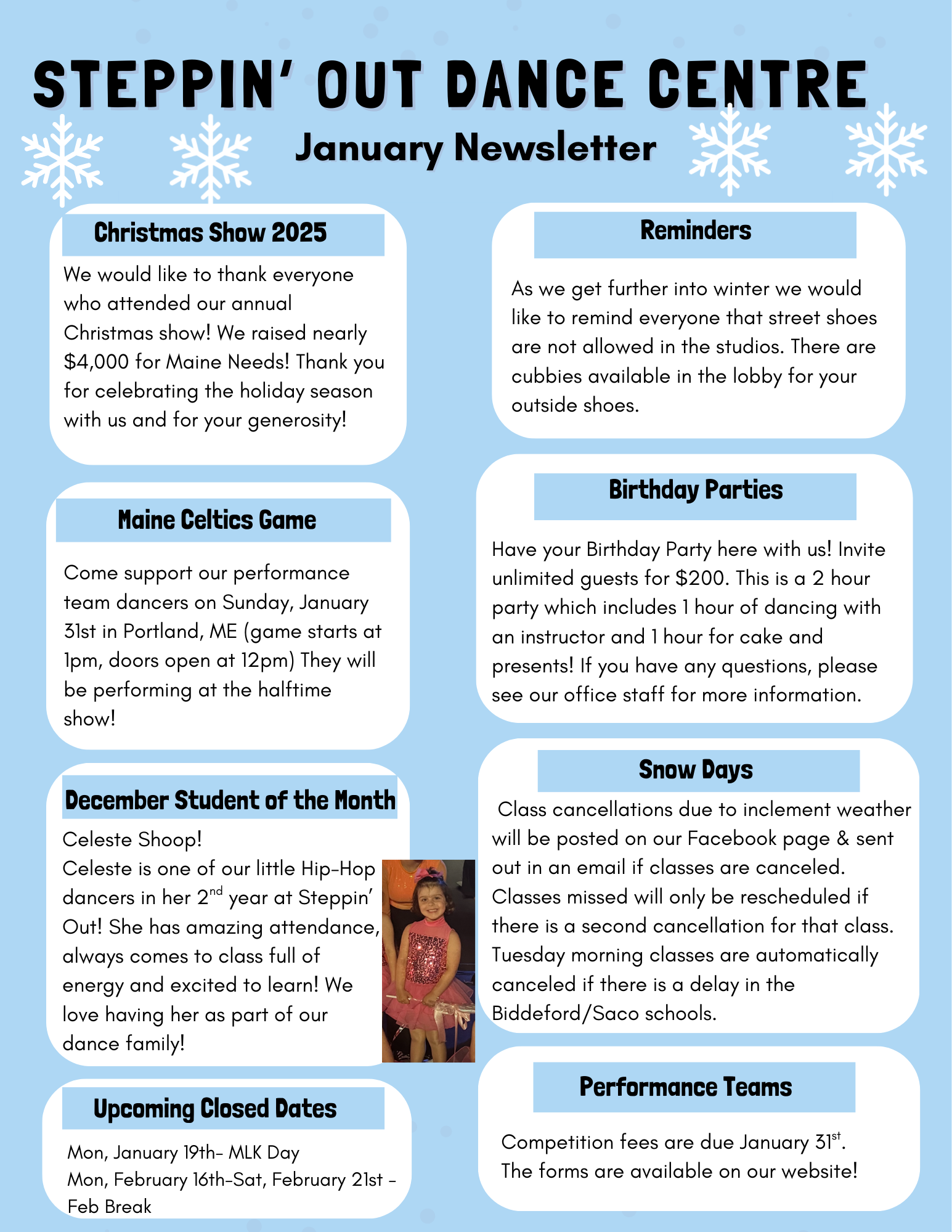 Our newsletters come out each month during our regular season with the latest information on the studio, performances, and more. Besides being posted here you will find these are handed out to each student the first week of each month as well as being emailed. Please let us know if you are not on our email list or if you are not receiving our information.