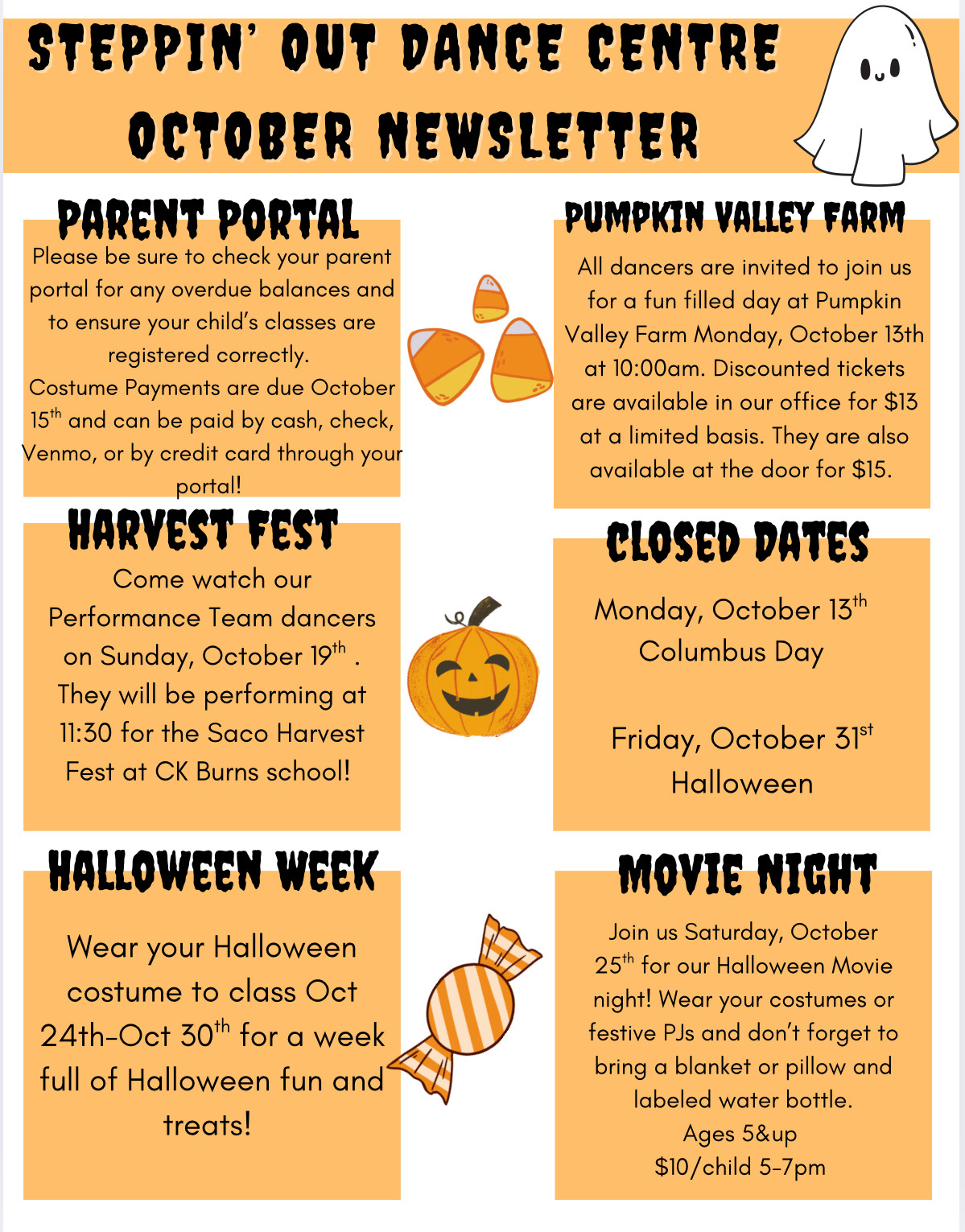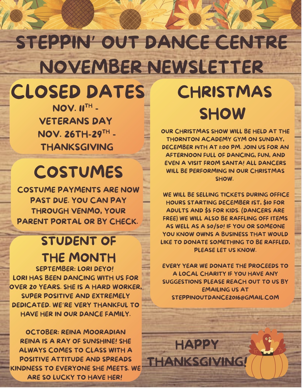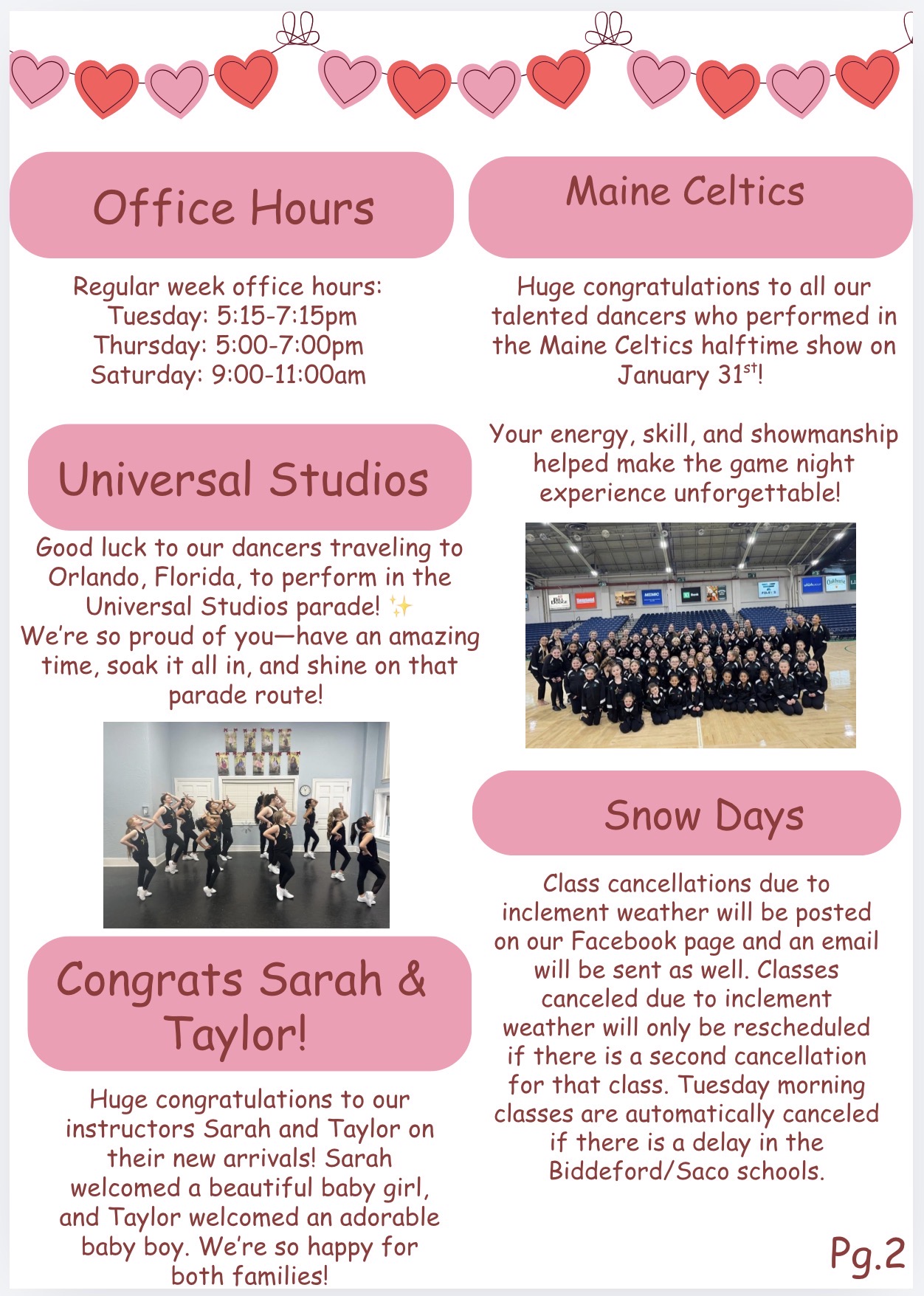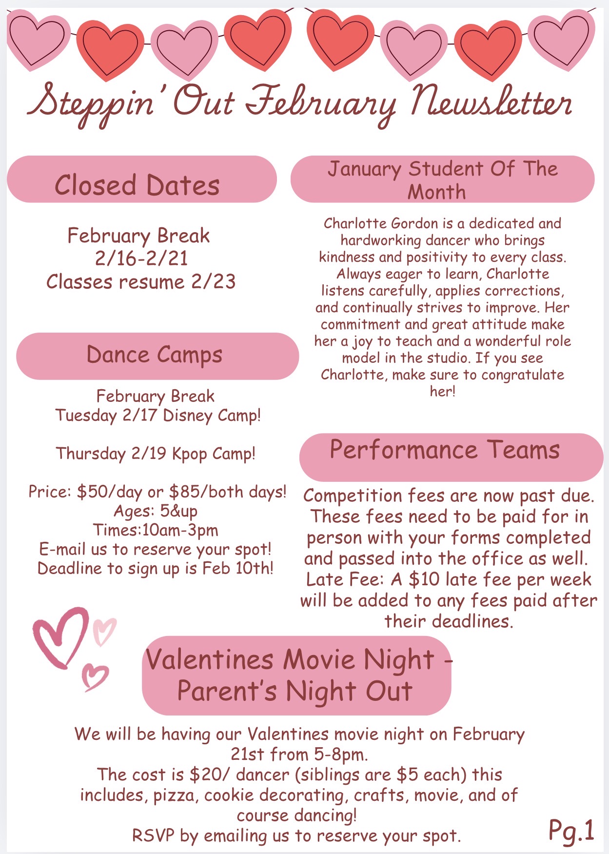 Our newsletters come out each month during our regular season with the latest information on the studio, performances, and more. Besides being posted here you will find these are handed out to each student the first week of each month as well as being emailed. Please let us know if you are not on our email list or if you are not receiving our information.